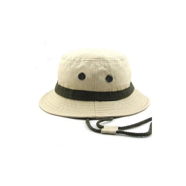 Product description: Cotton fishing bucket hat with ventilated metal eyelets and string. This style is trimed with herringbone ribbon. Plain bucket hats without logo.